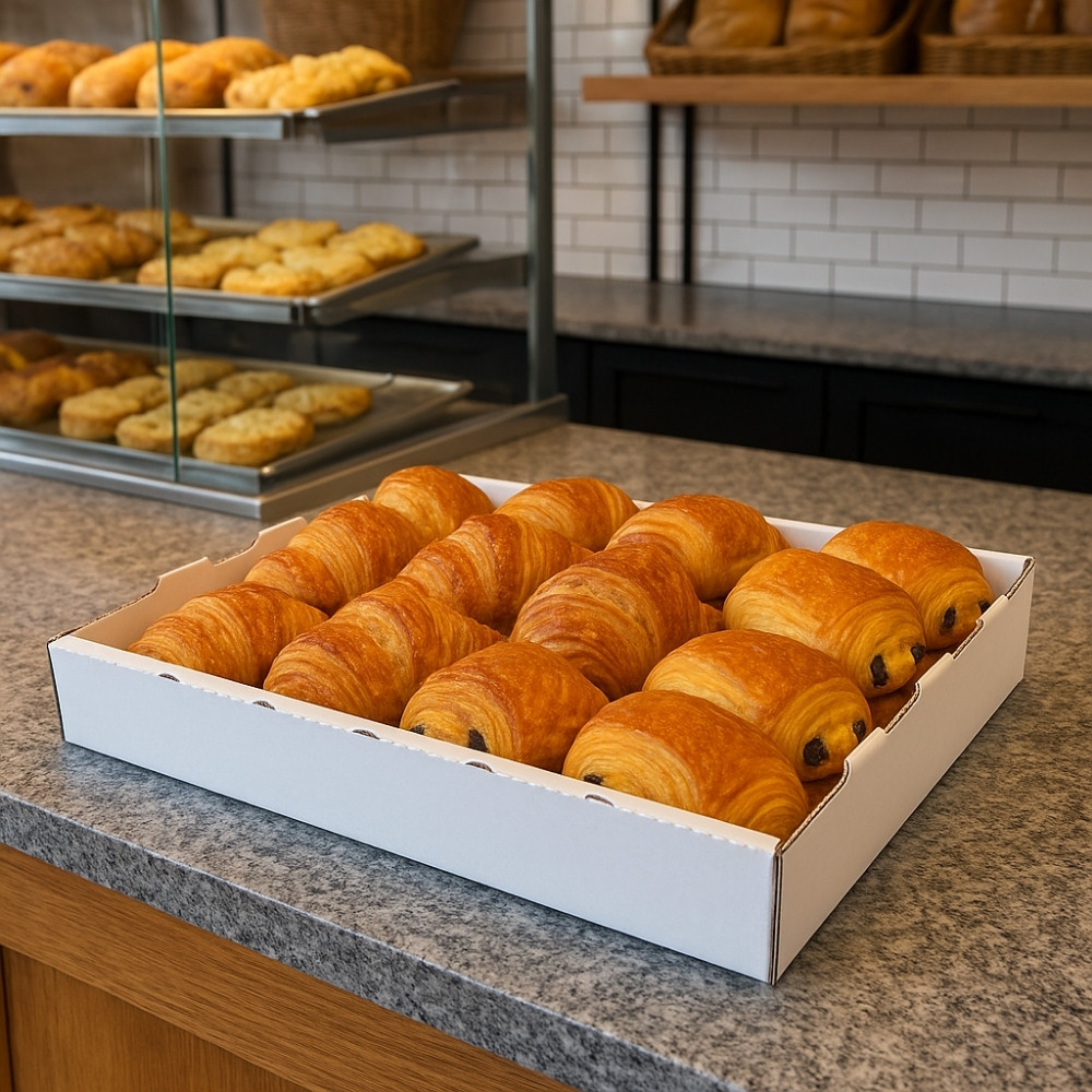 Plateau de regroupement en carton blanc 65X42.4X9.3 cm : robuste, empilable et pratique pour transporter et stocker vos préparations.